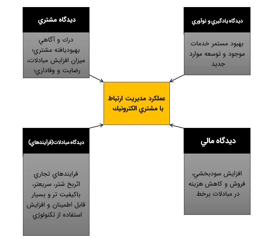 اين بعد از BSC بيشتر بر حوزه هاي ارتقاي عمليات، كارآيي و اثربخشي تمركز دارد. و همكاران پاسخگويي به خواسته هاي مشتريان و كارايي پياده سازي ليو مديريت ارتباط با مشتري الكترونيك را بر حسب كاهش هزينه، صرفه جويي در زمان و ...، به عنوان دو سنجة اصلي موفقيت مديريت ارتباط با مشتري الكترونيك در نظر گرفته اند. رومانو و فجرمستاد نيز با استناد به دستاوردهاي اسكولين و همكاران از «بهبود خدمات و حمايت مشتري» و «كارآيي بالاتر و كاهش هزينه» به عنوان فاكتورهاي حياتي و مهم ياد ميكنند. در همين حال، برخي محققين، اثربخشي تكنولوژي و قابليت مبادلاتي را از جمله ملاكهاي ارزيابي مديريت ارتباط با مشتري الكترونيك دانسته اند. آنها معتقدند كه، BSC براي مبادلات الكترونيك مشتمل بر سنجه هايي همچون موفقيت در انجام سفارشات، از كار افتادگي و سهولت دسترسي سيستم، امنيت و قابليت اطمينان سيستم است. عوامل زيربناي تكنولوژيكي (قابليت دسترسي سيستم، فرصت طلبي، حمايت از كاربران متعدد، پاسخگويي سيستم، يكپارچگي تماس با مشتري، تكنولوژي هاي امن و نيز از ديگر موارد حياتي در اين زمينه قلمداد شده اند (سيواكومار كيفيت خدمات آنلاين و مديريت محتواي وبسايت نيز از اهداف مورد نظر استراوس و همكاران )در استفاده از BSC براي يك شركت مبادلات الكترونيك بوده است. با توجه به تحقيقات مذكور و ساير بازنگري هاي صورت گرفته در ادبيات، تجارب مختلف ناشي از اجراي مديريت ارتباط با مشتري الكترونيك از ديدگاه مبادلات داخلي اينترنتي عبارتند از: